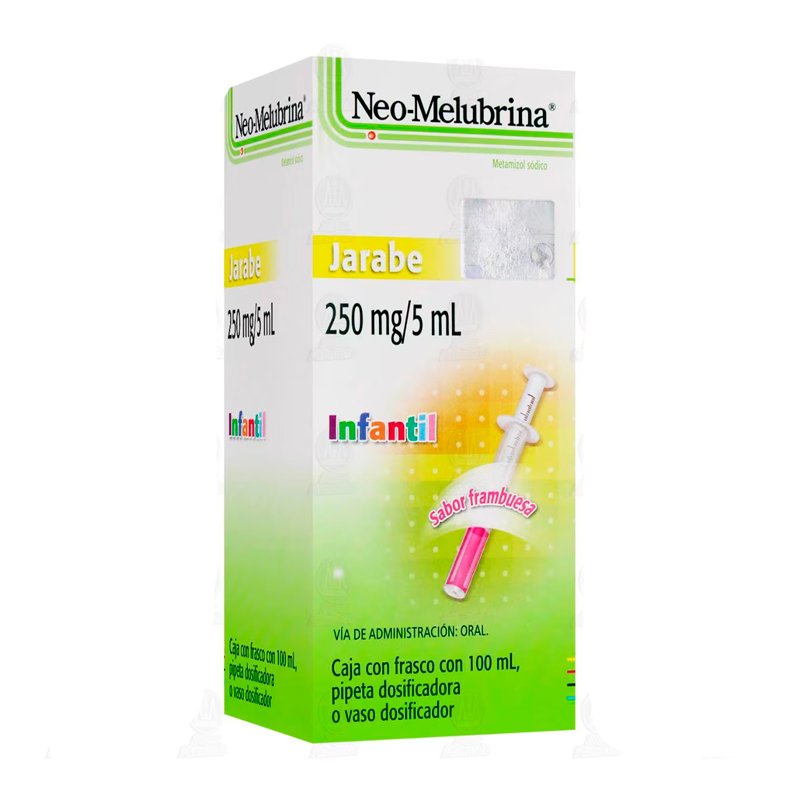 Neo Melubrina jarabe en frasco de 100 mL y pipeta dosificadora y/o vaso dosificador. Sabor frambuesa.